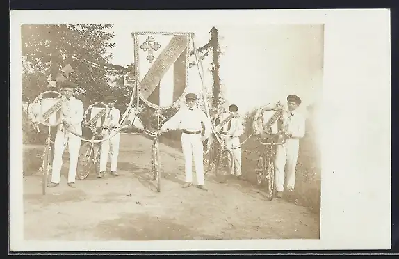 AK Mitglieder eines Radfahr-Vereins mit ihrem Wappen