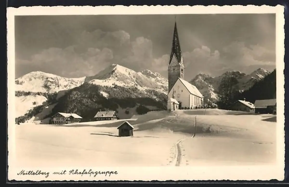 AK Mittelberg /Kleinwalsertal, Ortsansicht mit Schafsalpgruppe im Winter