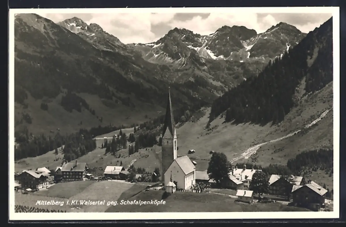 AK Mittelberg i. Kl. Walsertal, Kirche, Blick auf Schafalpenköpfe