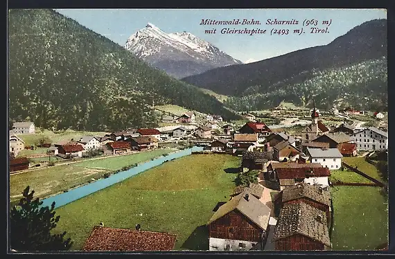 AK Mittenwald, Fernansicht mit Scharnitz und Gleirschspitze