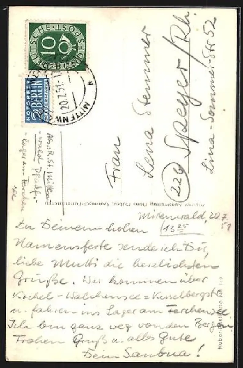 Personenbezogene Daten auf der Rückseite der Karte wurden durch blauen Textmarker unkenntlich gemacht. Die blauen Stellen sind auf die Vorderseite durchgeweicht und wirken sich negativ auf das Postkartenfoto aus