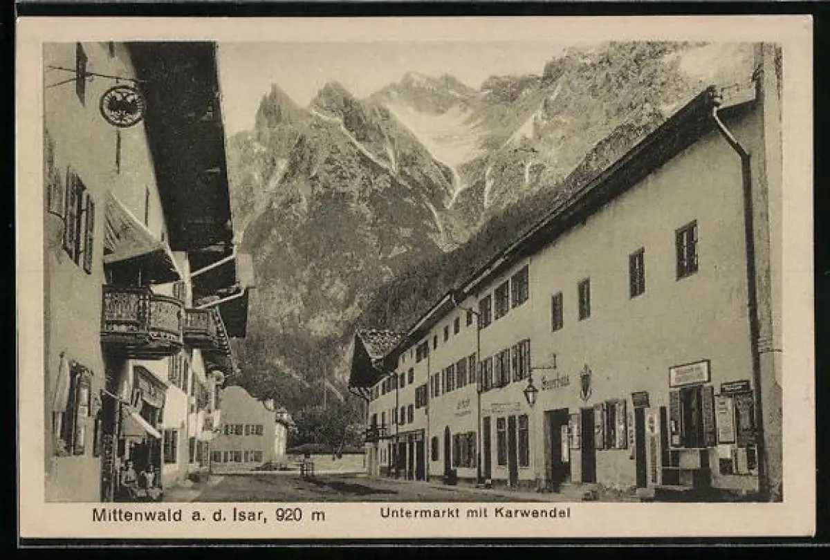 AK Mittenwald a. d. Isar, Untermarkt mit Gasthaus und Karwendel
