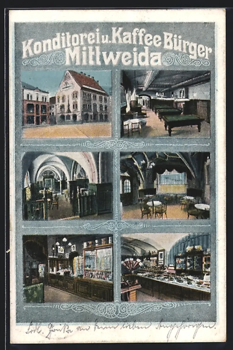 AK Mittweida, Konditorei u. Kaffee Bürger, Innen- und Aussenansicht