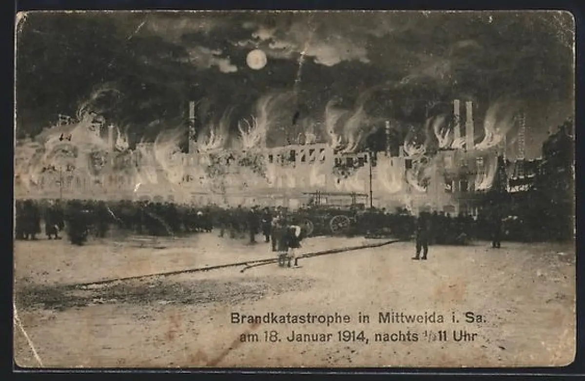 AK Mittweida i. Sa., Brandkatastrophe 1914, Brennende Stadt