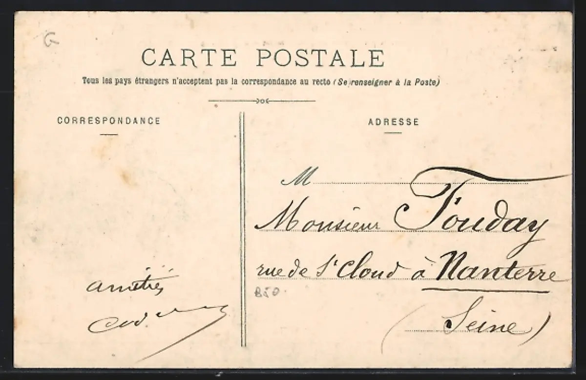 Personenbezogene Daten auf der Rückseite der Karte wurden durch blauen Textmarker unkenntlich gemacht. Die blauen Stellen sind auf die Vorderseite durchgeweicht und wirken sich negativ auf das Postkartenfoto aus