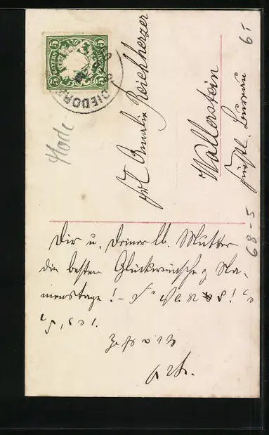 Personenbezogene Daten auf der Rückseite der Karte wurden durch blauen Textmarker unkenntlich gemacht. Die blauen Stellen sind auf die Vorderseite durchgeweicht und wirken sich negativ auf das Postkartenfoto aus