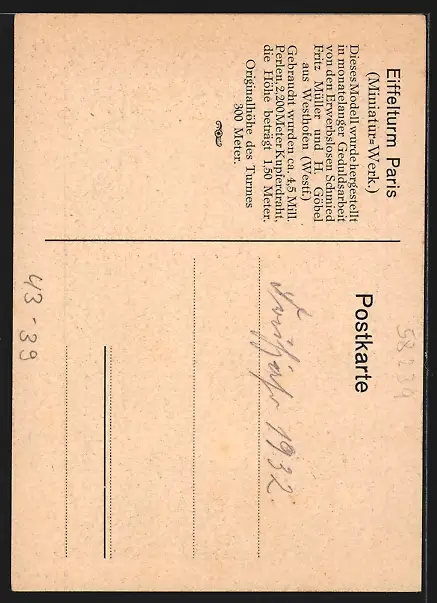 Personenbezogene Daten auf der Rückseite der Karte wurden durch blauen Textmarker unkenntlich gemacht. Die blauen Stellen sind auf die Vorderseite durchgeweicht und wirken sich negativ auf das Postkartenfoto aus