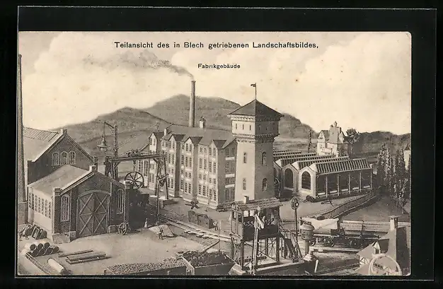 AK Modellbau, Teilansicht des in Blech getriebenen Landschaftsbildes, Fabrikgebäude