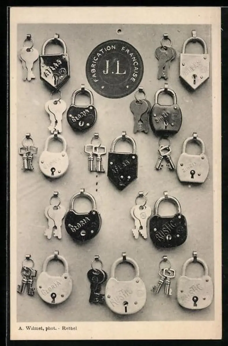 AK Modelle verschiedener Vorhängeschlösser französischer Fabrikation, Reklame