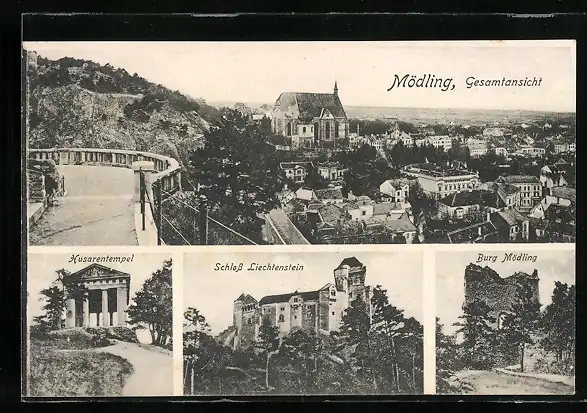 AK Mödling, Husaren-Tempel, Burg Liechtenstein, Burg Mödling und Totale