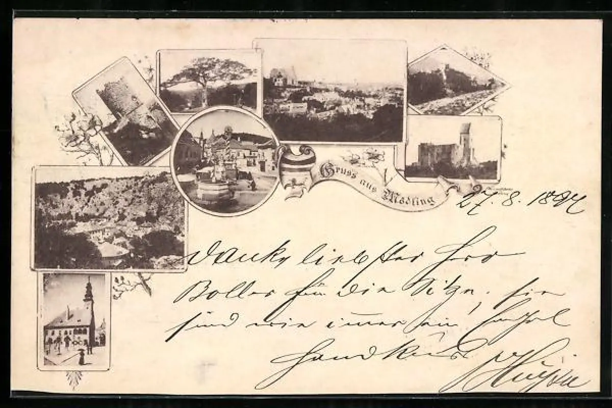 AK Mödling, Ruine, Kirche, Denkmal und Panorama