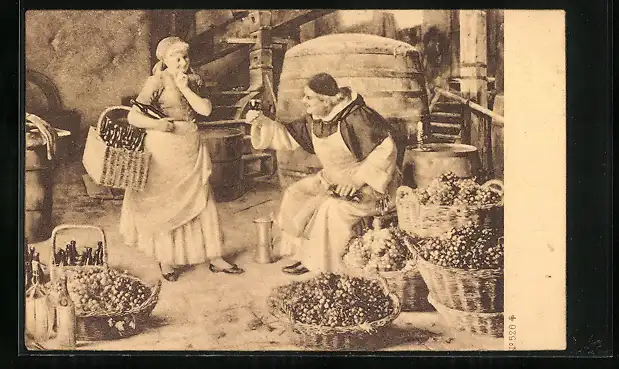 AK Mönch im Weinkeller bietet jungem Mädchen ein Glas an