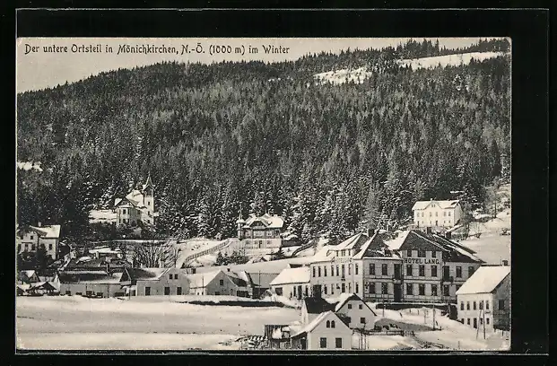 AK Mönichkirchen, Der untere Ortsteil mit Hotel Lang im Winter