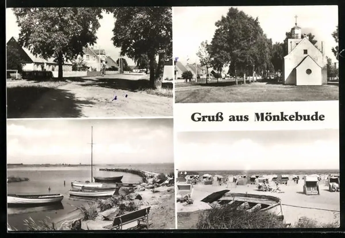 AK Mönkebude, Dorfstrasse, Kirchpartie, Hafenpartie, Partie am Badestrand