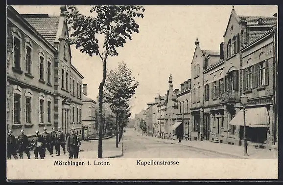 AK Mörchingen, Kapellenstrasse mit Soldaten