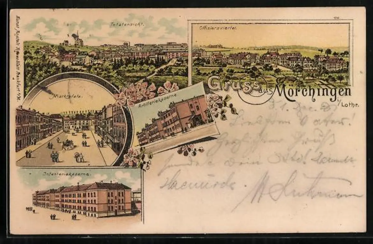 AK Mörchingen i. Lothr., Artilleriekaserne, Infanteriekaserne, Offiziersviertel und Marktplatz