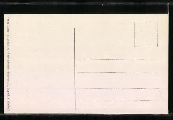 Personenbezogene Daten auf der Rückseite der Karte wurden durch blauen Textmarker unkenntlich gemacht. Die blauen Stellen sind auf die Vorderseite durchgeweicht und wirken sich negativ auf das Postkartenfoto aus