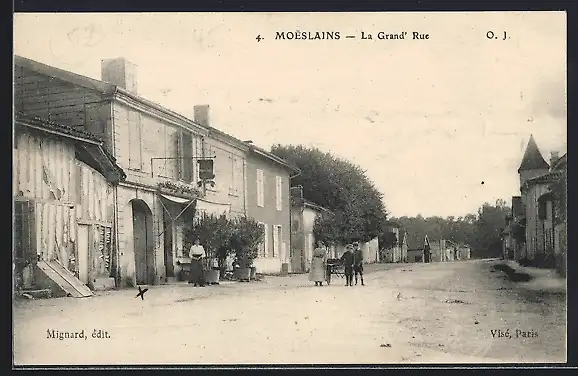 AK Moëslains, La Grand` Rue avec passants et maisons anciennes