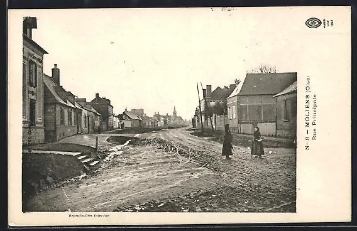AK Moliens /Oise, Rue Principale avec deux passants et maisons alignées
