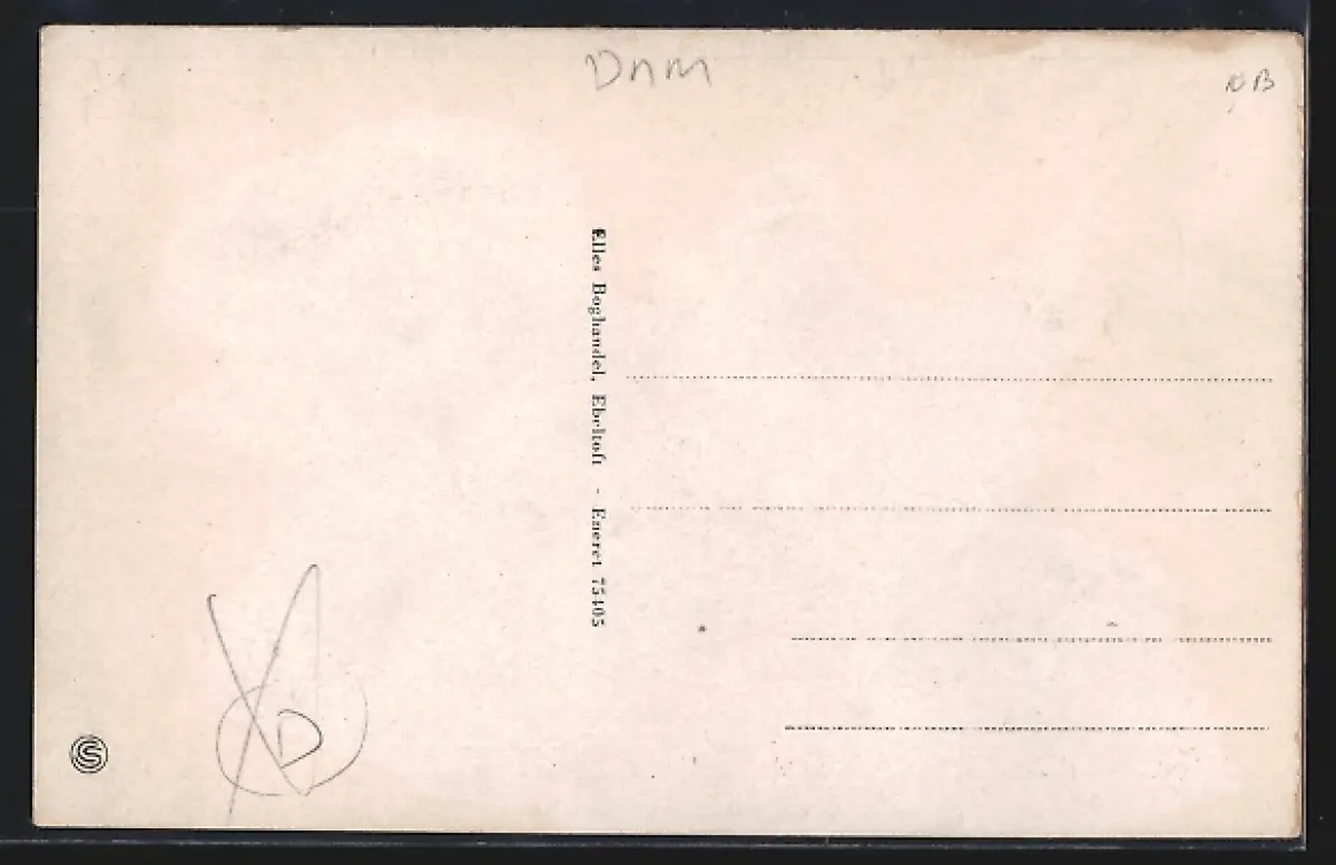 Personenbezogene Daten auf der Rückseite der Karte wurden durch blauen Textmarker unkenntlich gemacht. Die blauen Stellen sind auf die Vorderseite durchgeweicht und wirken sich negativ auf das Postkartenfoto aus