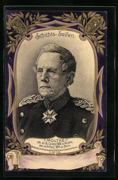 AK Moltke in Uniform, Porträt, Reichseinigungskriege, Reklame Georg Schicht Seifen- & Kerzenfabrik, geprägter Rahmen