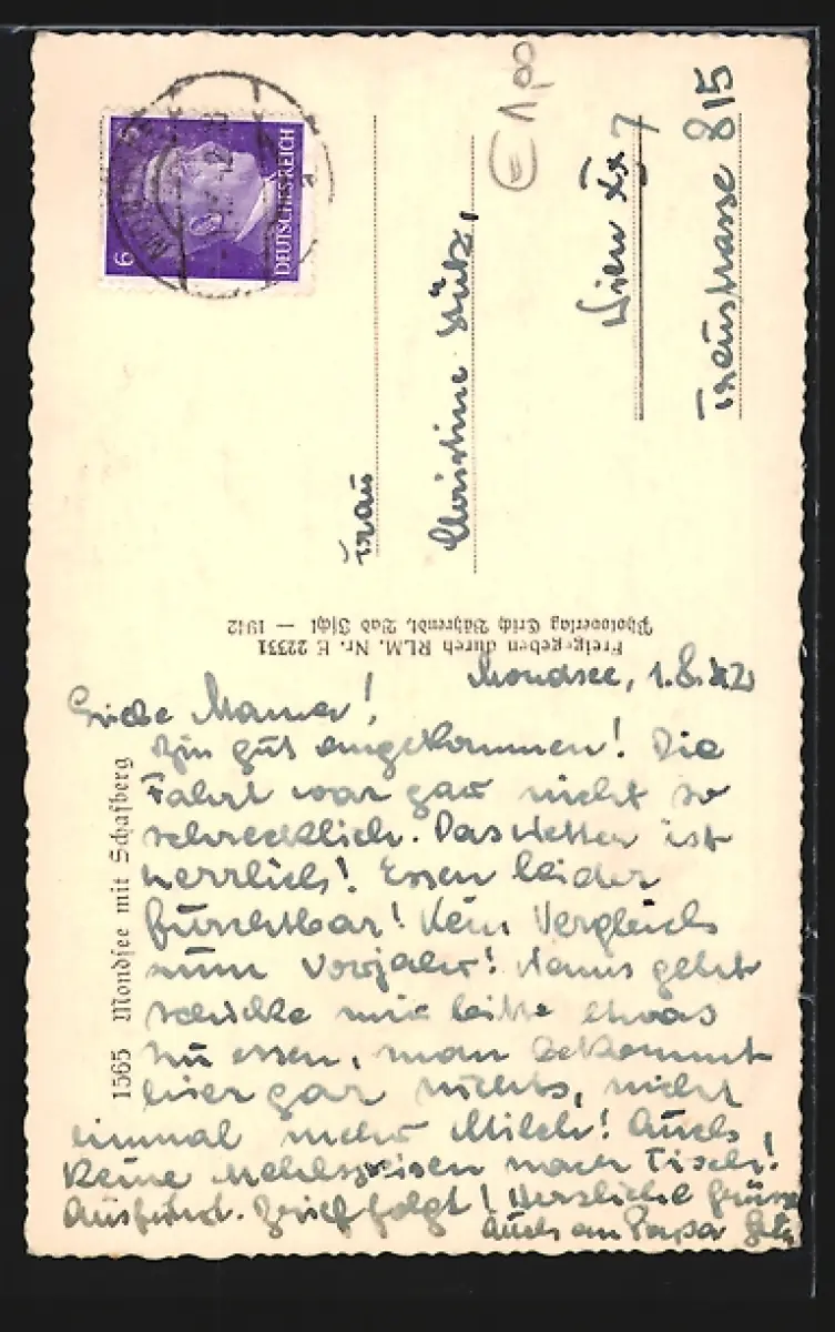 Personenbezogene Daten auf der Rückseite der Karte wurden durch blauen Textmarker unkenntlich gemacht. Die blauen Stellen sind auf die Vorderseite durchgeweicht und wirken sich negativ auf das Postkartenfoto aus