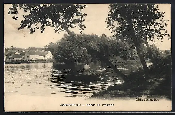 AK Monéteau, Bords de l`Yonne avec barque et village en arrière-plan