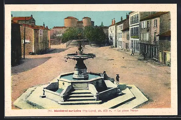 AK Monistrol-sur-Loire, La place Néron avec fontaine et bâtiments environnants