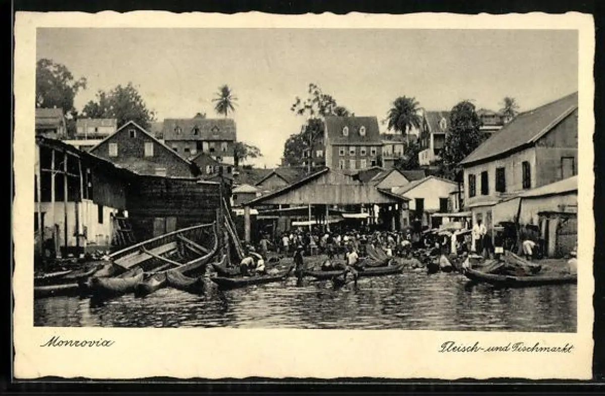 AK Monrovia, Fleisch- und Fischmarkt, Ansicht vom Wasser, Panorama