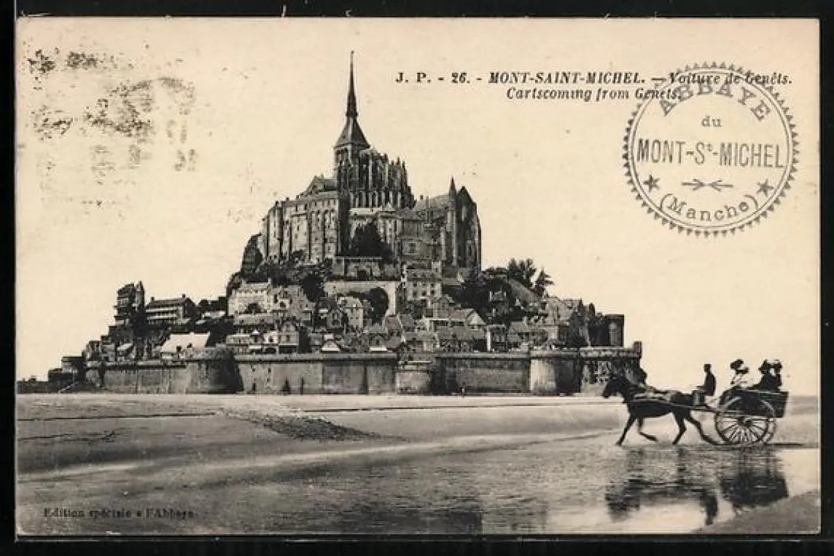 AK Mont-Saint-Michel, Vue générale de l`abbaye et du village avec une calèche au premier plan