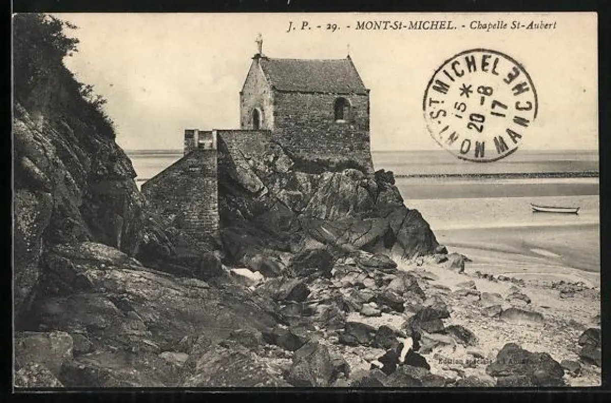 AK Mont-St-Michel, Chapelle St-Aubert sur les rochers avec vue sur la mer et une barque