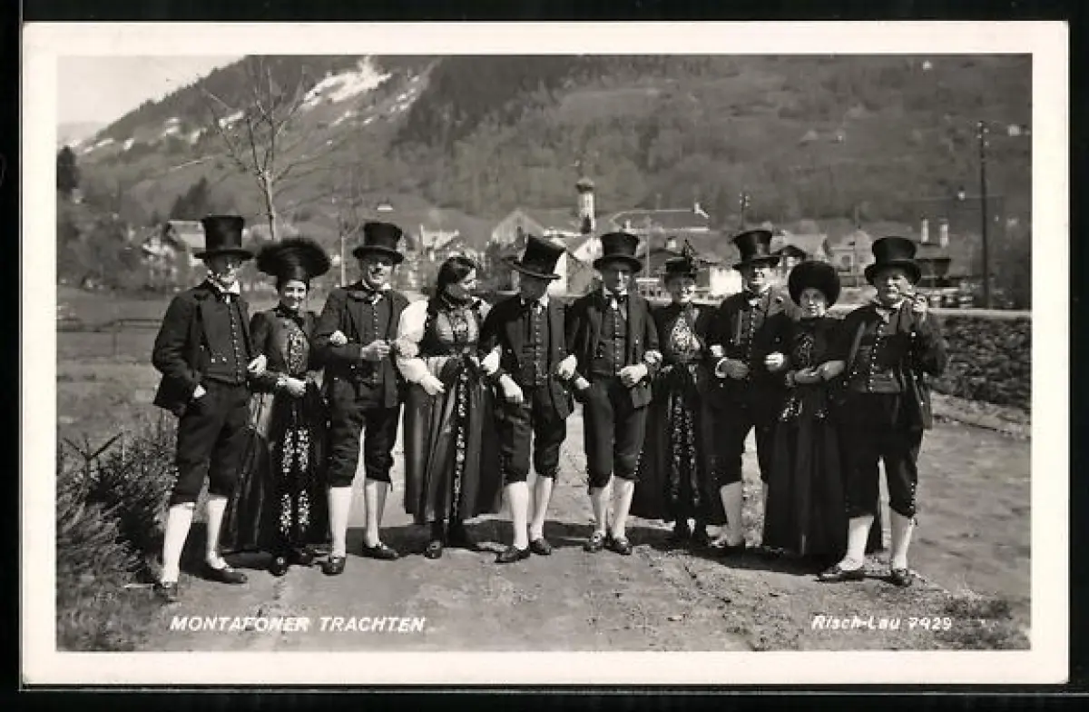 AK Montafon, Montafoner Trachten, Gruppe auf der Strasse vor einer Ortschaft