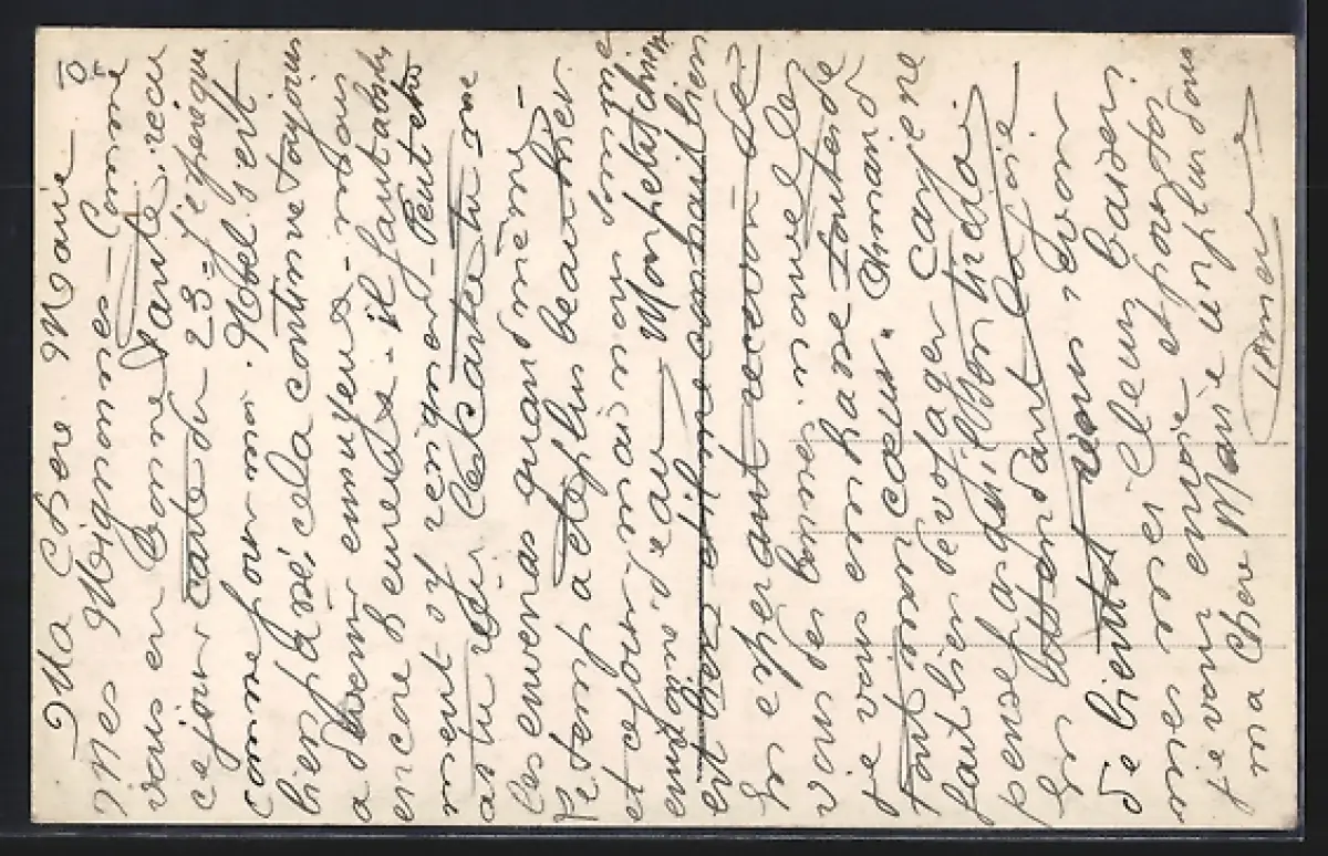 Personenbezogene Daten auf der Rückseite der Karte wurden durch blauen Textmarker unkenntlich gemacht. Die blauen Stellen sind auf die Vorderseite durchgeweicht und wirken sich negativ auf das Postkartenfoto aus