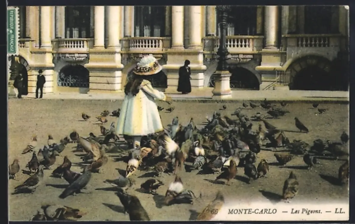 AK Monte-Carlo, Les Pigeons, Mädchen beim Taubenfüttern