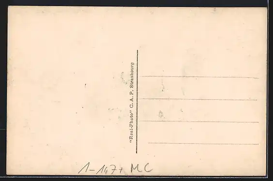 Personenbezogene Daten auf der Rückseite der Karte wurden durch blauen Textmarker unkenntlich gemacht. Die blauen Stellen sind auf die Vorderseite durchgeweicht und wirken sich negativ auf das Postkartenfoto aus