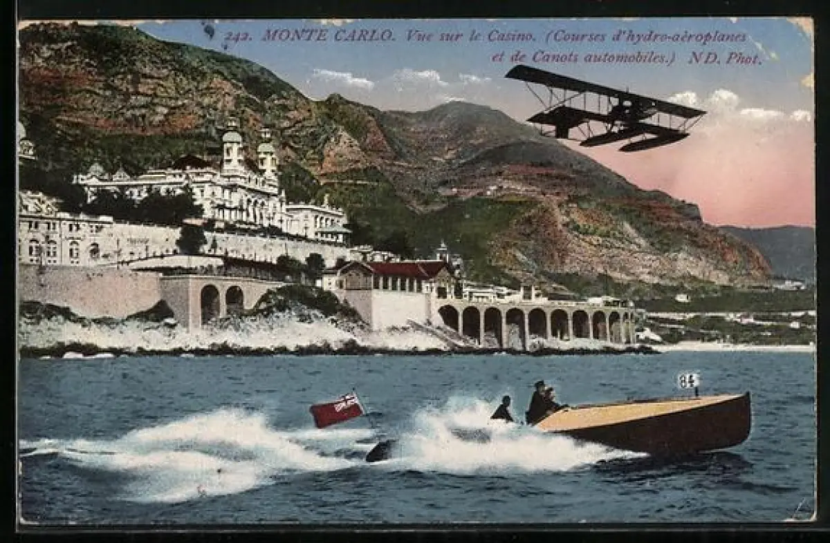 AK Monte Carlo, vue sur le casino, cours d`hydro-aèroplanes et de canots automobiles