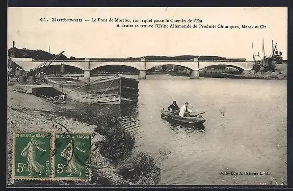 AK Montereau, Le Pont de Monceau avec barques et l`usine chimique Merck à droite
