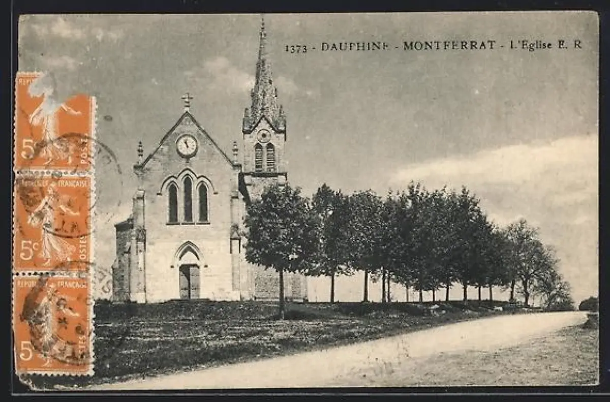 AK Montferrat, L`Église E.R. et allée bordée d`arbres