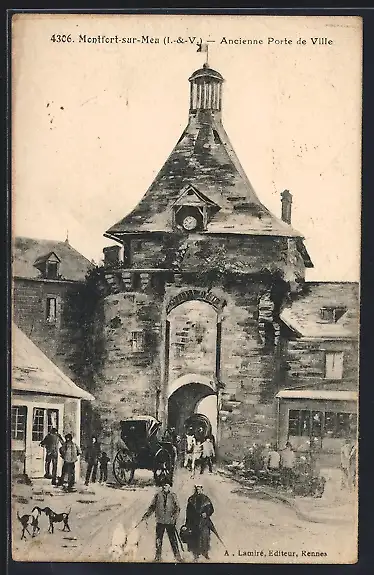 AK Montfort-sur-Meu, Ancienne Porte de Ville avec calèches et passants