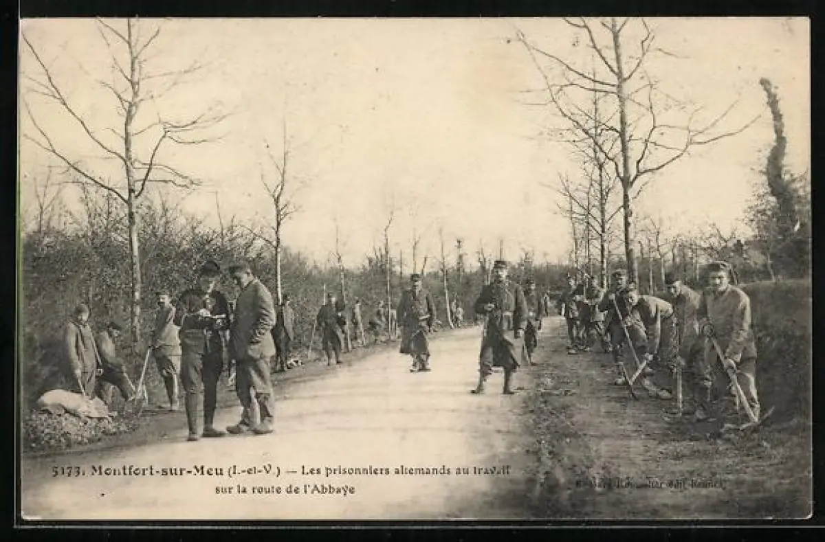 AK Montfort-sur-Meu, Les prisonniers Allemands au travail sur la route de l`Abbaye