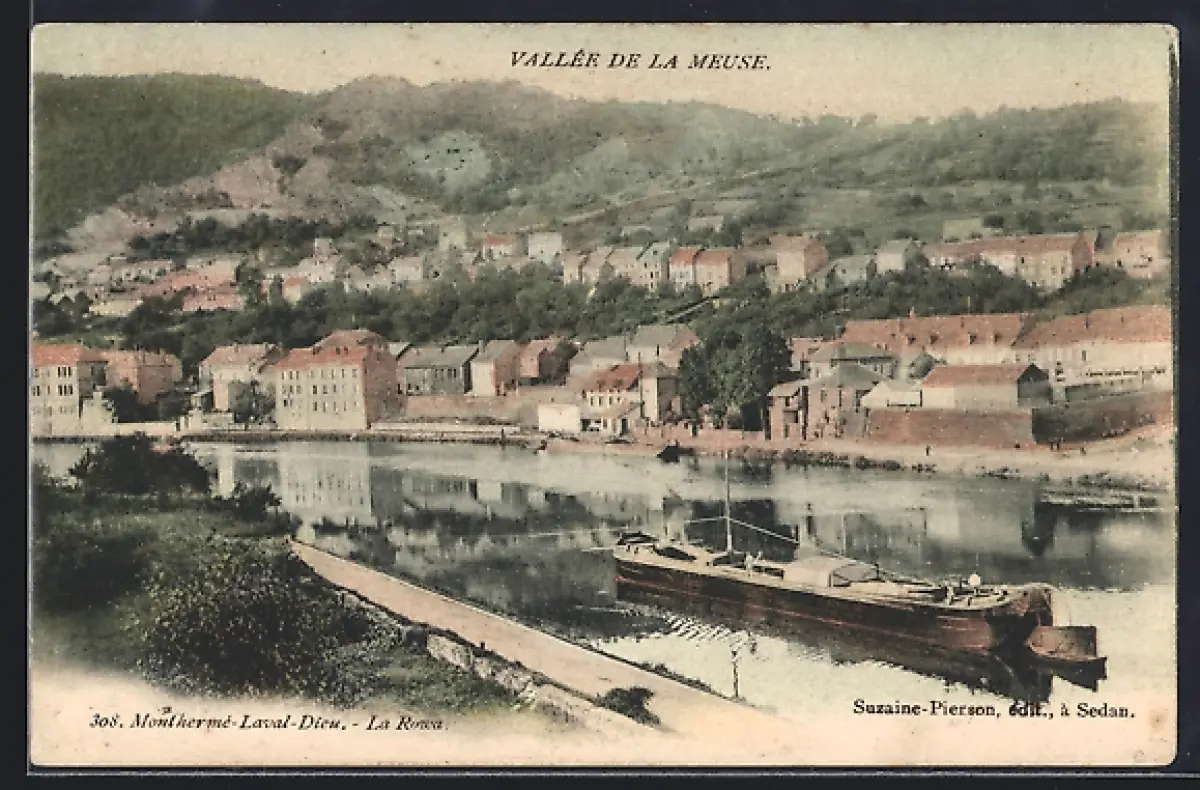 AK Monthermé-Laval-Dieu, Bateau sur la Meuse et vue du village