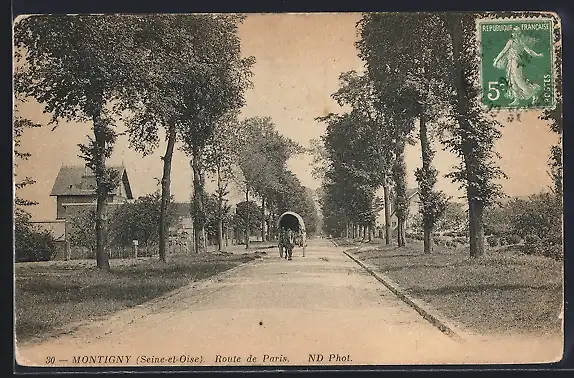 AK Montigny, Route de Paris avec charrette tirée par un cheval