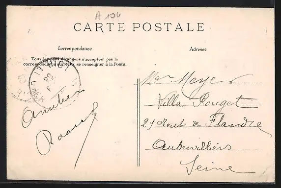 Personenbezogene Daten auf der Rückseite der Karte wurden durch blauen Textmarker unkenntlich gemacht. Die blauen Stellen sind auf die Vorderseite durchgeweicht und wirken sich negativ auf das Postkartenfoto aus