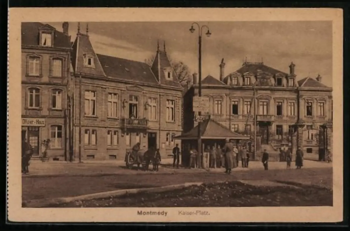 AK Montmédy, Kaiser-Platz avec bâtiments historiques et passants