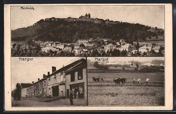 AK Montmédy, Totalansicht, Margut Strassenpartie, Leute bei der Feldarbeit in Margut