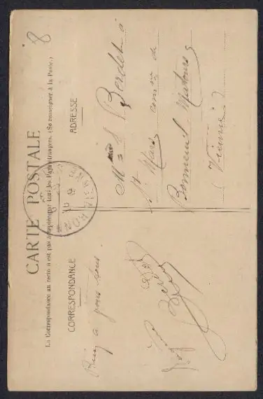 Personenbezogene Daten auf der Rückseite der Karte wurden durch blauen Textmarker unkenntlich gemacht. Die blauen Stellen sind auf die Vorderseite durchgeweicht und wirken sich negativ auf das Postkartenfoto aus