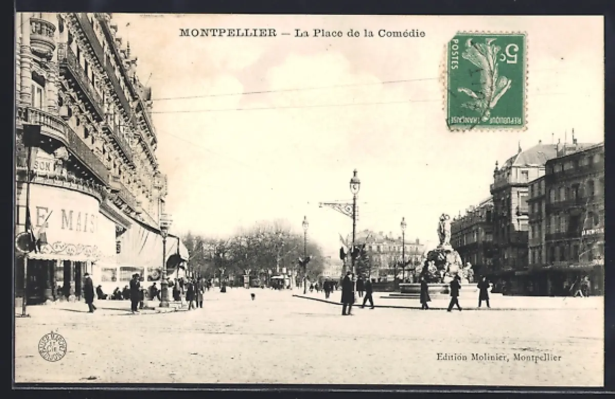 AK Montpellier, La Place de la Comédie avec passants et fontaine