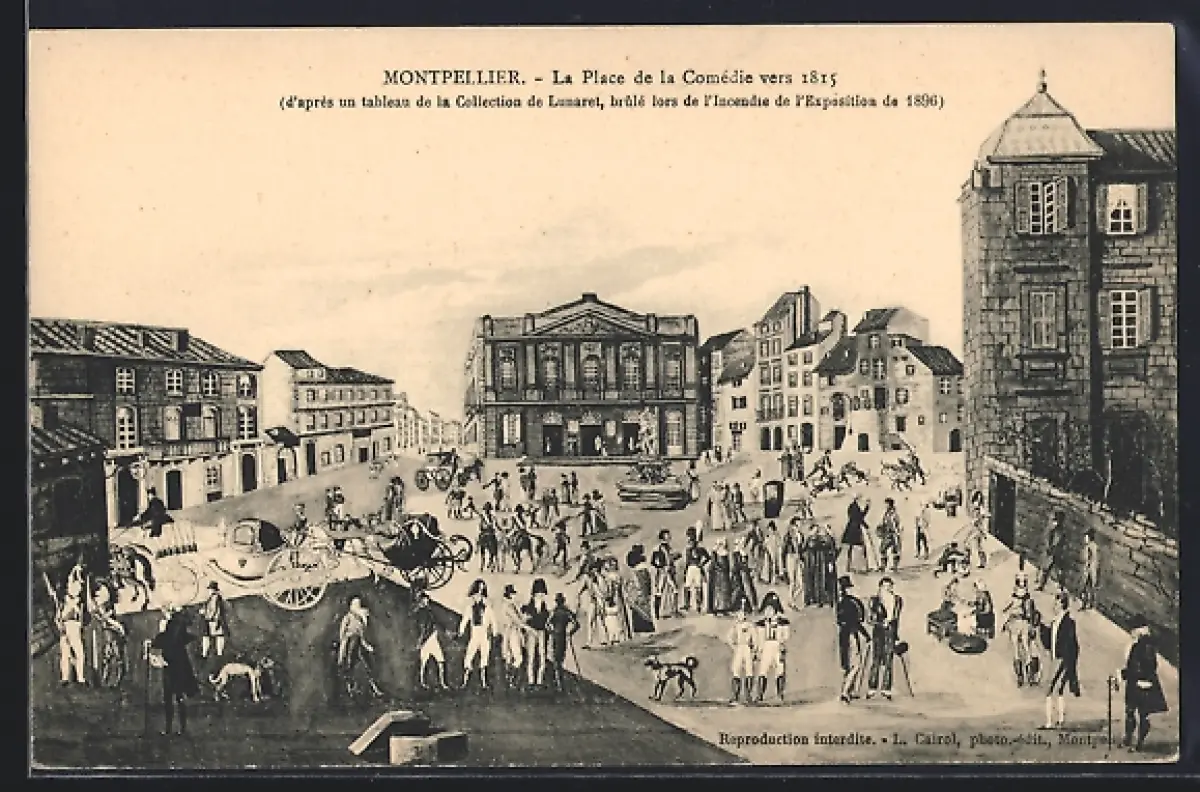 AK Montpellier, La Place de la Comédie vers 1825, scène animée d`après un tableau de la Collection de Lunaret