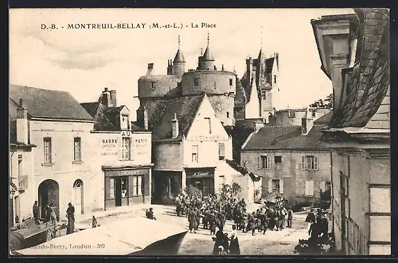 AK Montreuil-Bellay, La Place avec vue sur le château et la foule animée