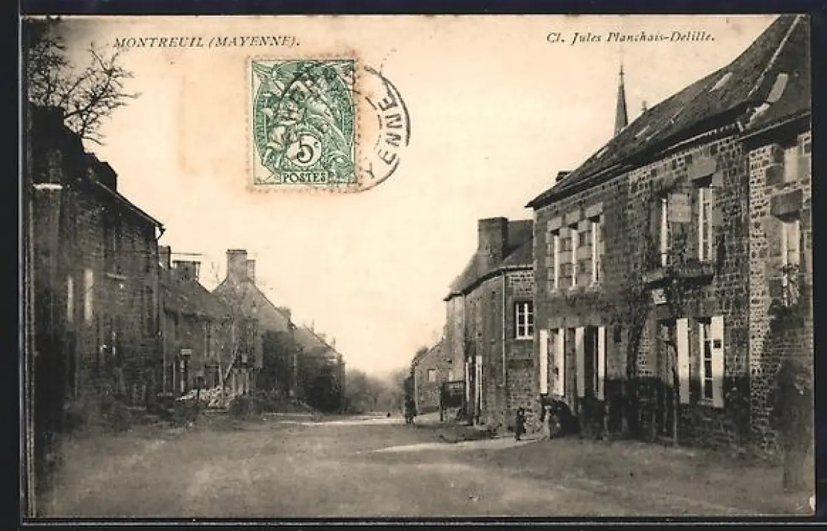 AK Montreuil /Mayenne, Rue principale avec maisons en pierre et perspective lointaine